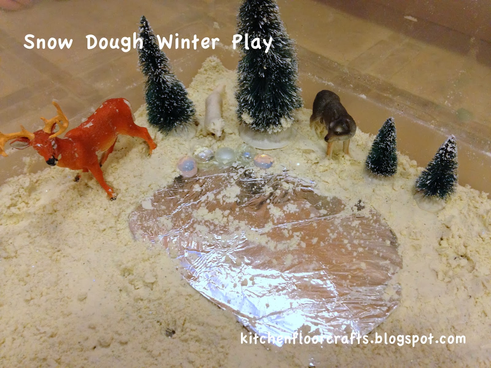 To start with we just played with the snow dough on its own. But then we decided to add in some animals, trees, clear marbles, and a tinfoil lake in order to create a winter play scene.