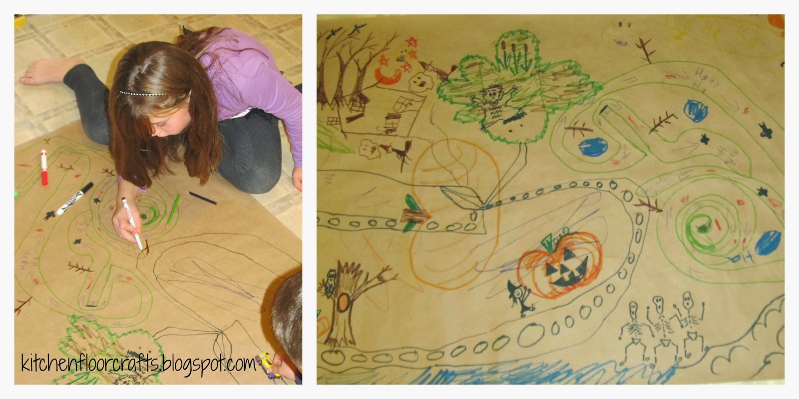 We usually start with taping a large piece of the brown paper to the floor. I like using painters' tape best as it won't be quite as sticky on the floor, yet is still rugged enough to last through lots of playing on the mat.