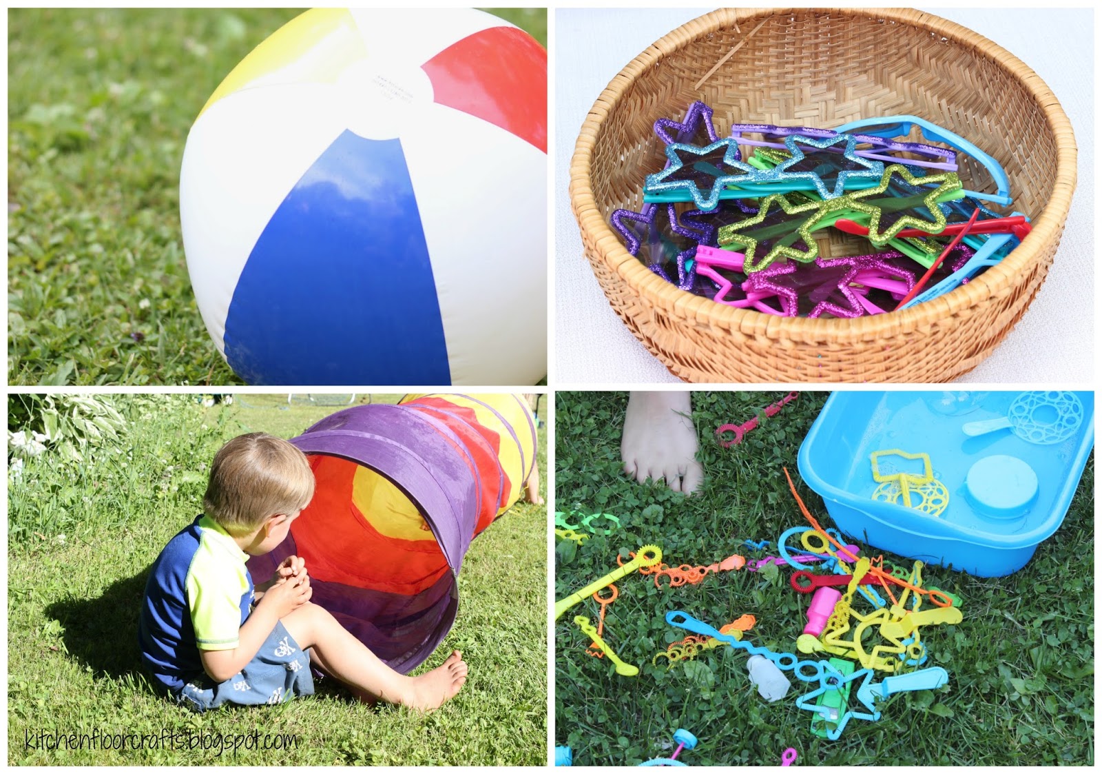 3. Have a few other things planned besides swimming. We bought several beach balls for 99¢ at the party store to have both in the pool and in the yard. Kids used them for a variety of games. We also bought a dozen pairs of fun, sparkly sunglasses. Bubbles and chalk were on hand too for kiddos to use. Finally, we put out a big basket of make your own obstacle course items for kids to play with. (Kids also just had a lot of fun enjoying the other parts of our yard and playing a big game of tag in the grass.)
